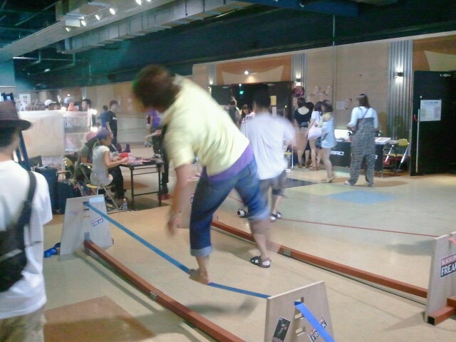 ディファ有明で行われた【ローラーディスコvol.2】へ行ってきました。 こちらでスラックラインfreakさんの体験会があったのでお手伝い~☆ 前回のローラーディスコでもやったのですが、今回も評判は上々♪ 色々な方に体験していただけたのでイベント的には成功!…ですよね?freakさん(笑) |